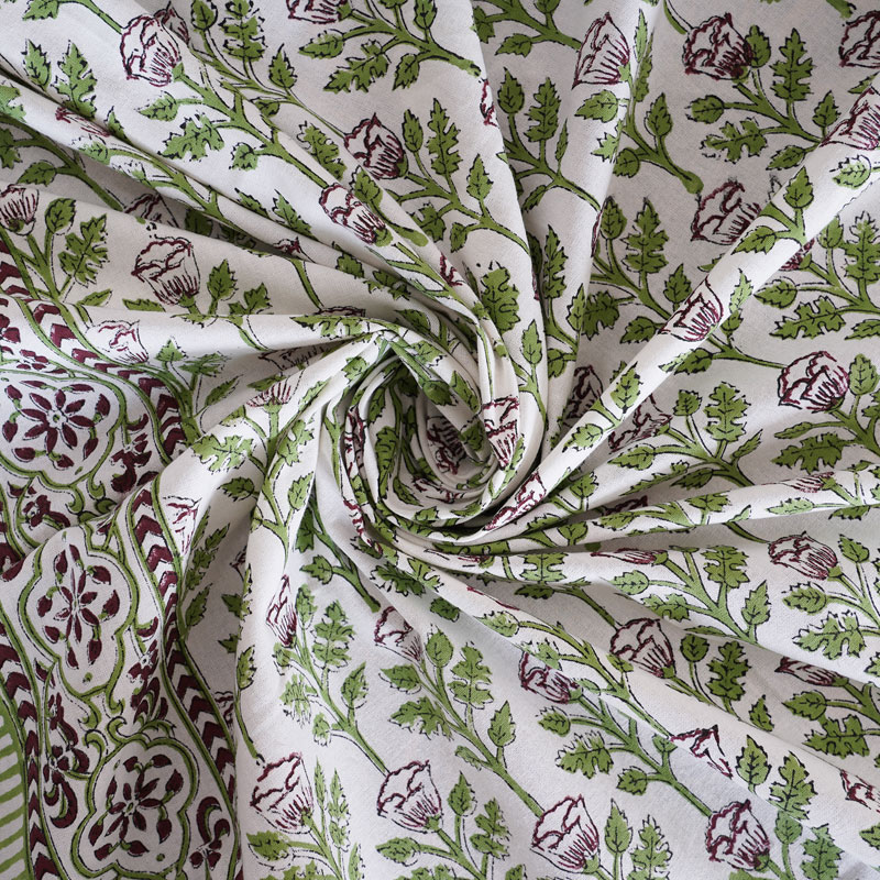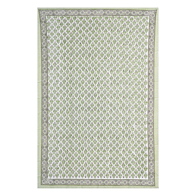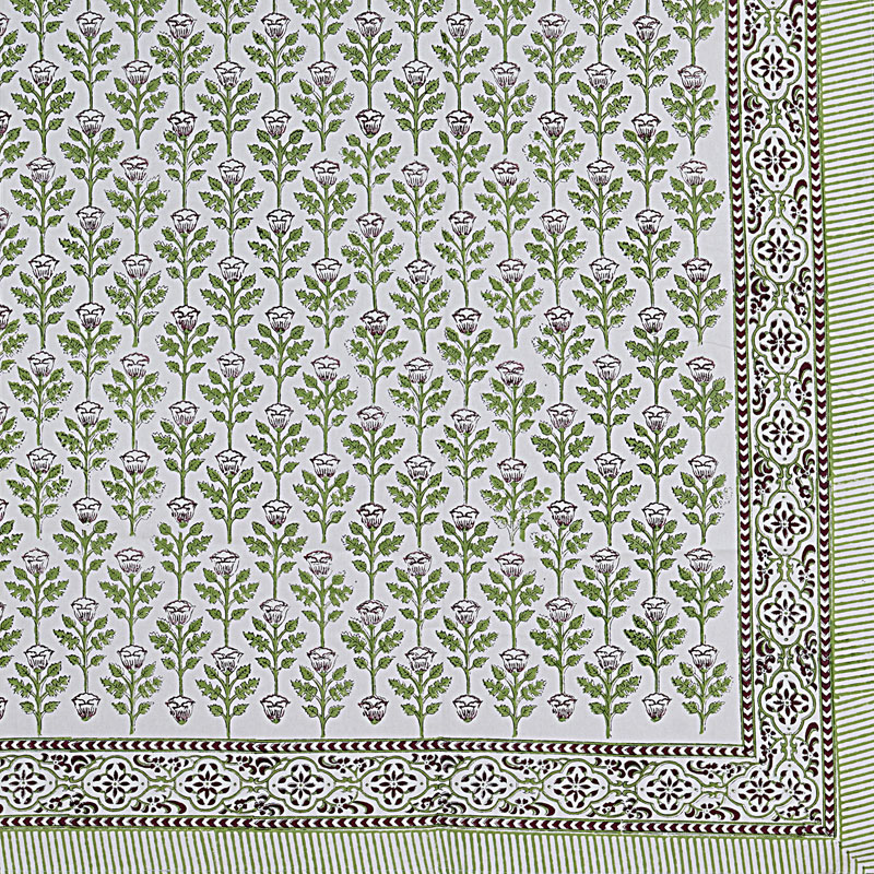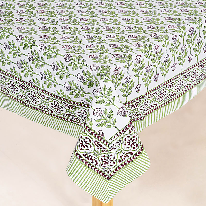 White and Green (90 X 60) Cotton Hand Block Print Table Cloth